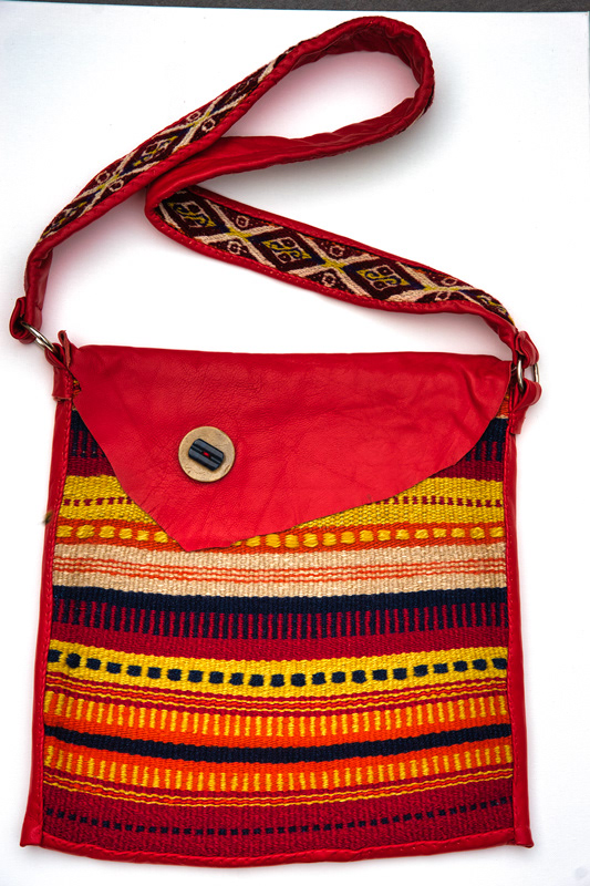 "Creative Fire" 14" x 15" hand bag. Made with wool, cotton, antique Peruvian braid strap, red leather flap and back. Wood decorative button with velcro closure. Cotton lining. $375